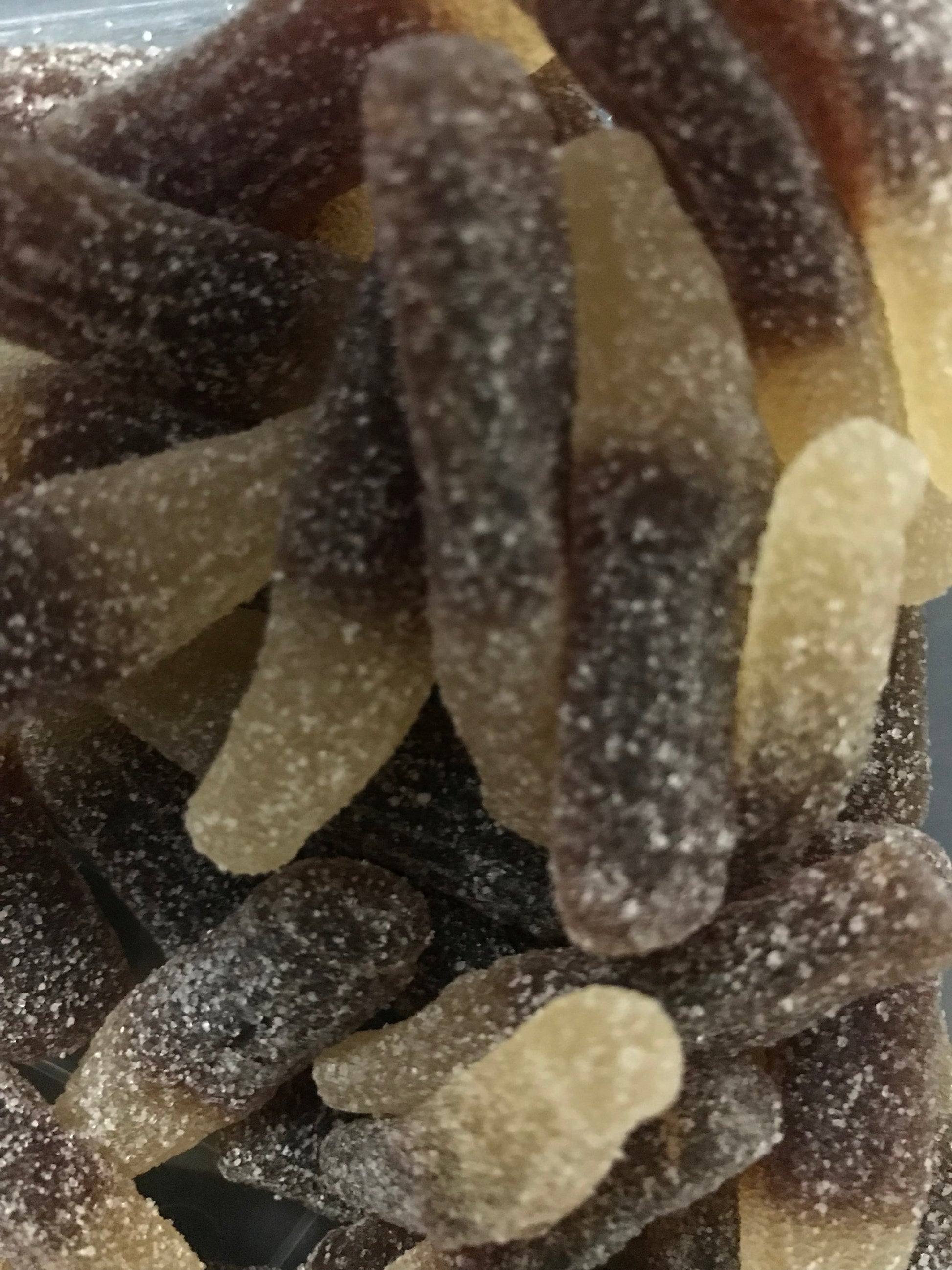 Sirop de glucose, sucre, gélatine de boeuf halal , amidon de maîs, gélifiant, arômes colorants; E150d