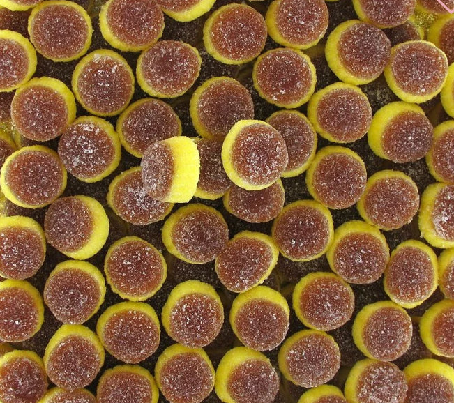 Sirop de glucose, sucre, eau, gélatine de boeuf Halal, amidon modifié de pomme de terre, acidifiants : E330, E270, E296, pectine, arôme artificiel, agent d'enrobage : cire de carnauba, colorants : E100, E150c.