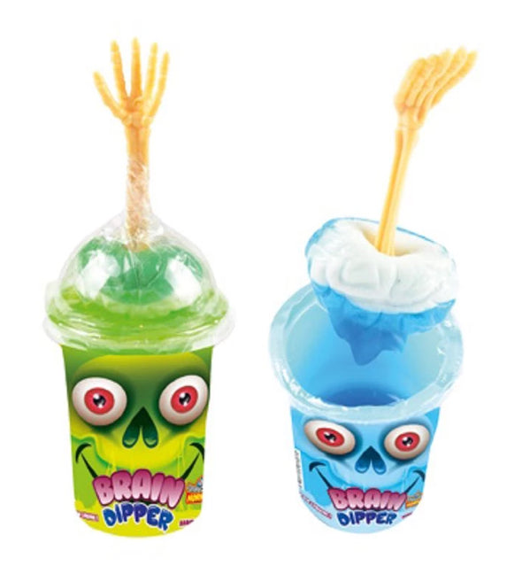 Une sucette torsadée géante en forme de cerveau dotée d'un bâton en forme d'os (de bras ou de jambe), à tremper dans un délicieux bonbon gel au goût fruité et acidulé.